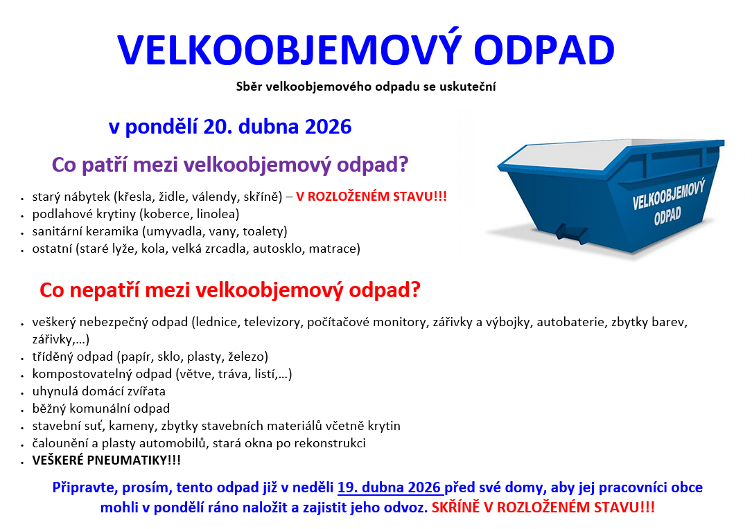 V pondělí 20. dubna proběhne v obci Uhlířov svoz velkoobjemového odpadu. Prosíme občany, aby tento odpad nachystali již v neděli 19. dubna před své domy.